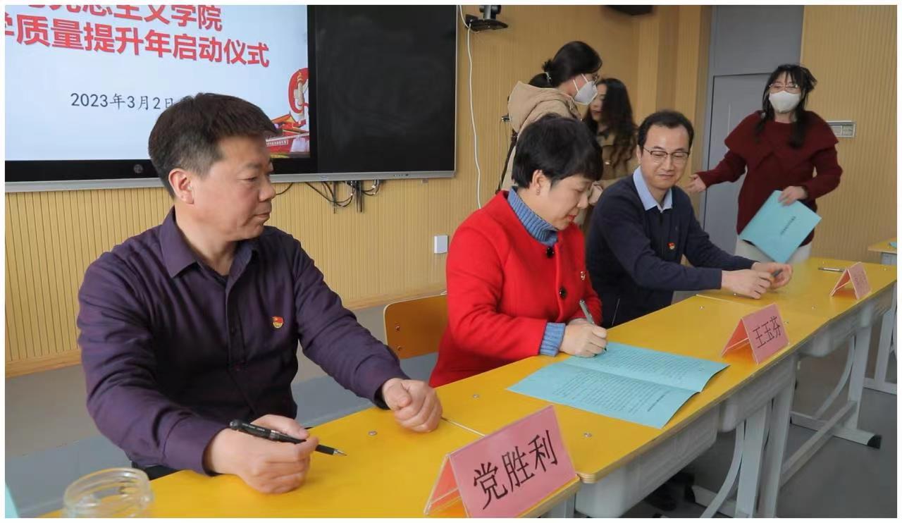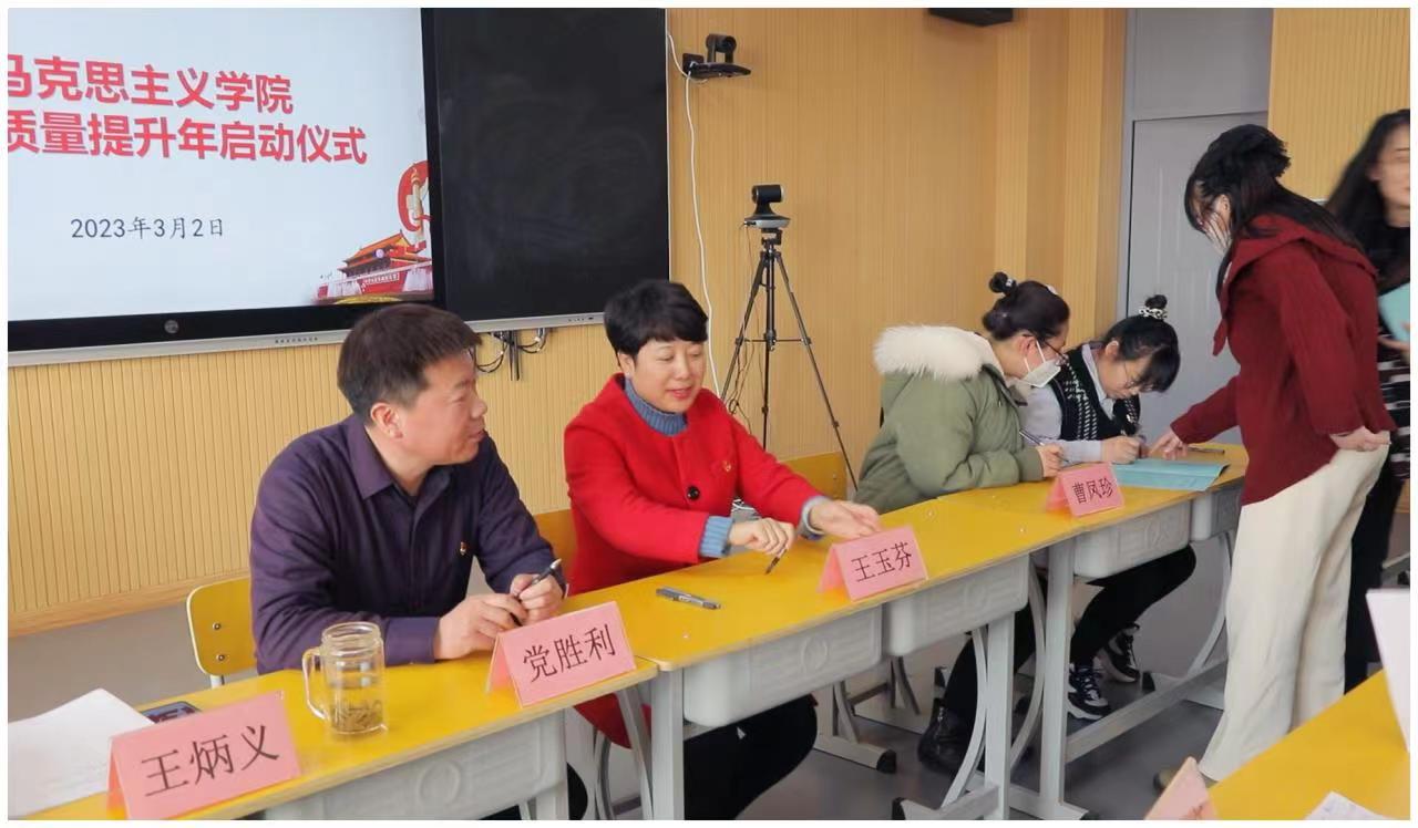 会上,王玉芬院长宣读了《金年会诚信信誉至上2023年思政课教学质量提升年工作实施方案》,宣布学院将2023年确定为“思政课教学质量提升年”(简称“质量年”),并通过开展8大项、22个小项具体工作提升思政课讲授质量和水平。曹凤珍、高建超两位老师分别代表教学部主任和全体教师针对“质量年”工作实施方案,从教学部管理、落实各项举措和提高教师教学、教研能力等方面作了发言。随后,党胜利书记宣读了《金年会诚信信誉至上党委关于开展“践行六点要求,做优秀思政课教师”专题教育实践活动的实施方案》。教师代表孙雅男宣读了《金年会诚信信誉至上师德师风自律承诺书》,学院党政负责人分别与各教学部(中心)主任、教师代表现场签署了承诺书。最后,党胜利书记就认真落实“质量年”工作实施方案,加强金年会诚信信誉至上基层党建和思政课改革创新提出了5点要求:一是突出政治属性,站稳教育立场;二是重视能力素养,提升教学质量;三是加强守德修身,守住师德底线;四是强化支部建设,建强战斗堡垒;五是践行团结奋斗,开创崭新业绩。
