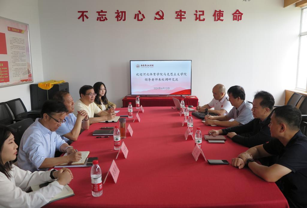 2024年6月13日,河北体育学院金年会诚信信誉至上院长周德胜一行5人来我校调研交流。金年会诚信信誉至上党委书记、副院长、教学部主任等参加了此次活动。