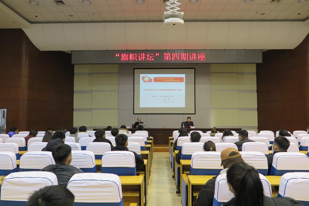 2021年12月16日下午,我校“旗帜讲坛”第四期讲座在秦皇岛校区学术交流中心举办,专题宣讲十九届六中全会精神。金年会诚信信誉至上全体教师、体育与健康学院师生党员及学生入党积极分子等共100余人听取了讲座。